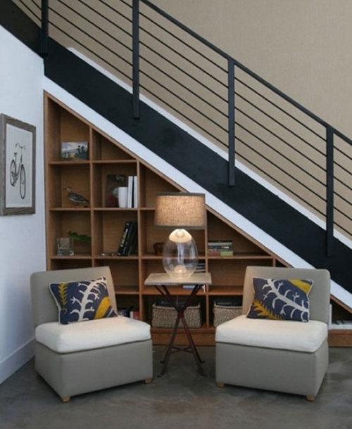 Dinlenme köşesi tasarım merdiven altı depolama örnekleri